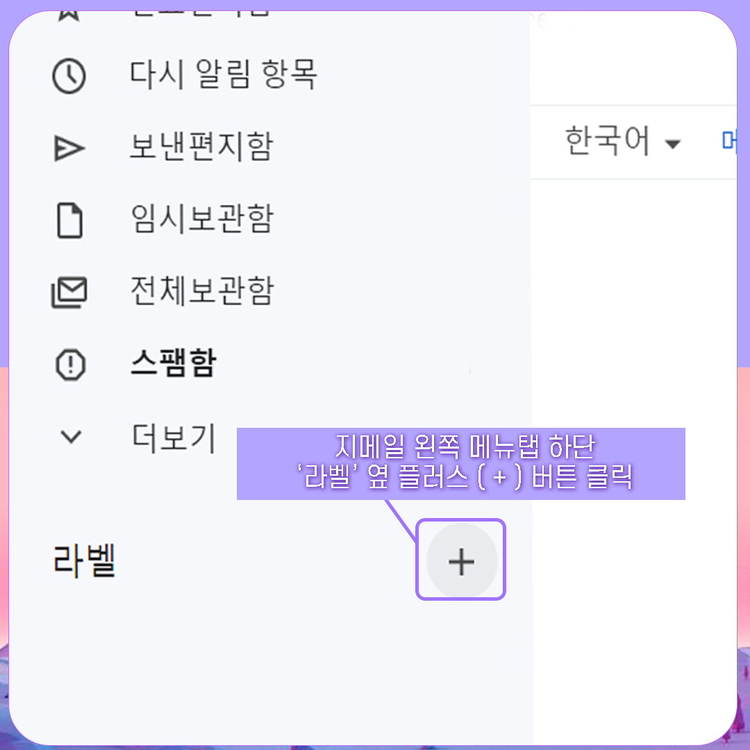 지메일로 접속하게 되면 왼편에 메일관리 설정 탭이 보이는데요. 가장 하단에 라벨이라고 되어있는 부분 오른편에 플러스(+)버튼을 클릭해줍니다. 라벨을 추가하는 버튼으로 새로운 메일정리함을 만들 때 사용하는 기능입니다.