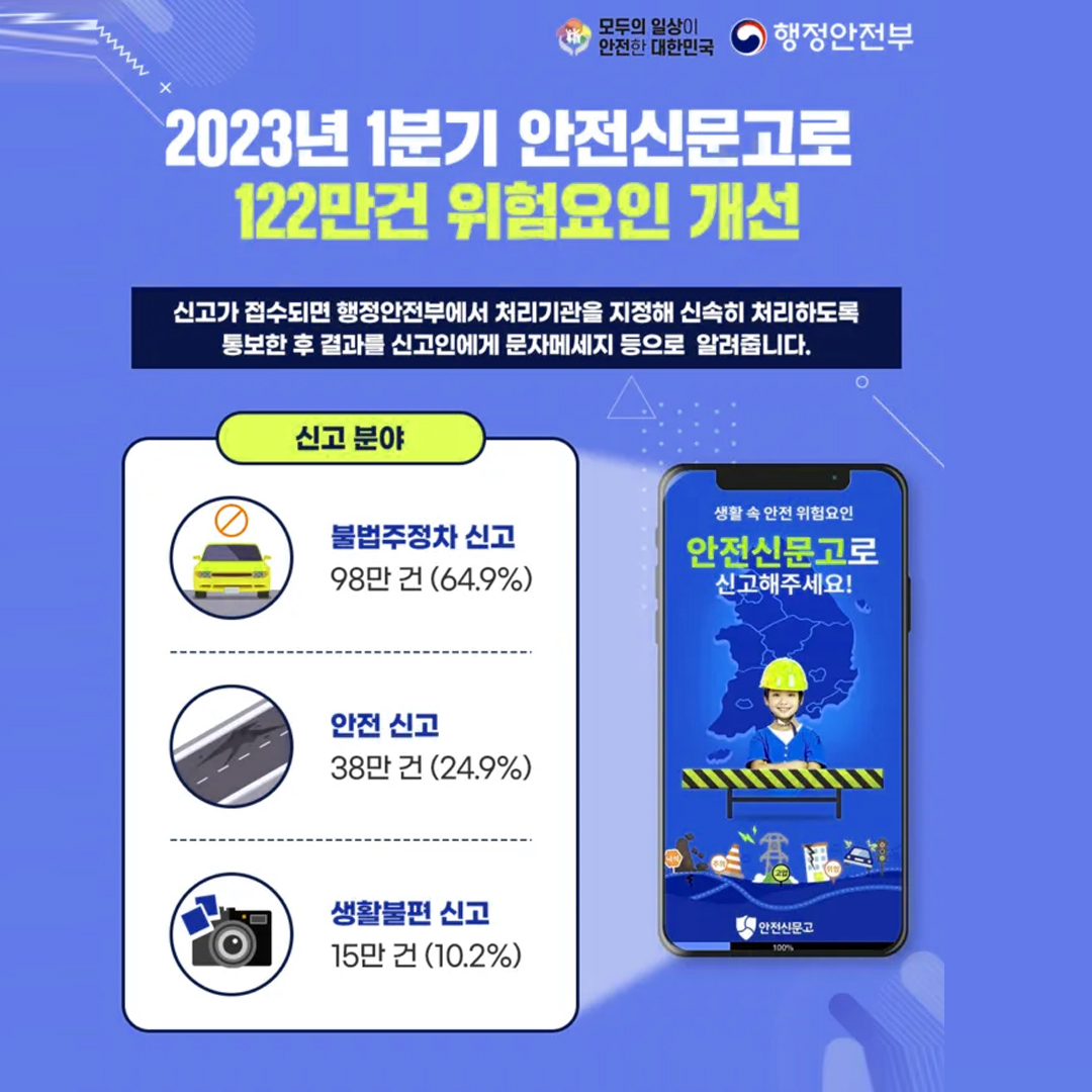 올해 초까지 ‘안전신문고’를 통해 접수된 신고 중 3분의 2 가량이 ‘불법 주정차 신고’인 것으로 나타났는데요. 행정안전부에 따르면 안전신문고앱을 통해 2023년 1분기에 총 151만여건의 안전신고가 접수됐다고 합니다.