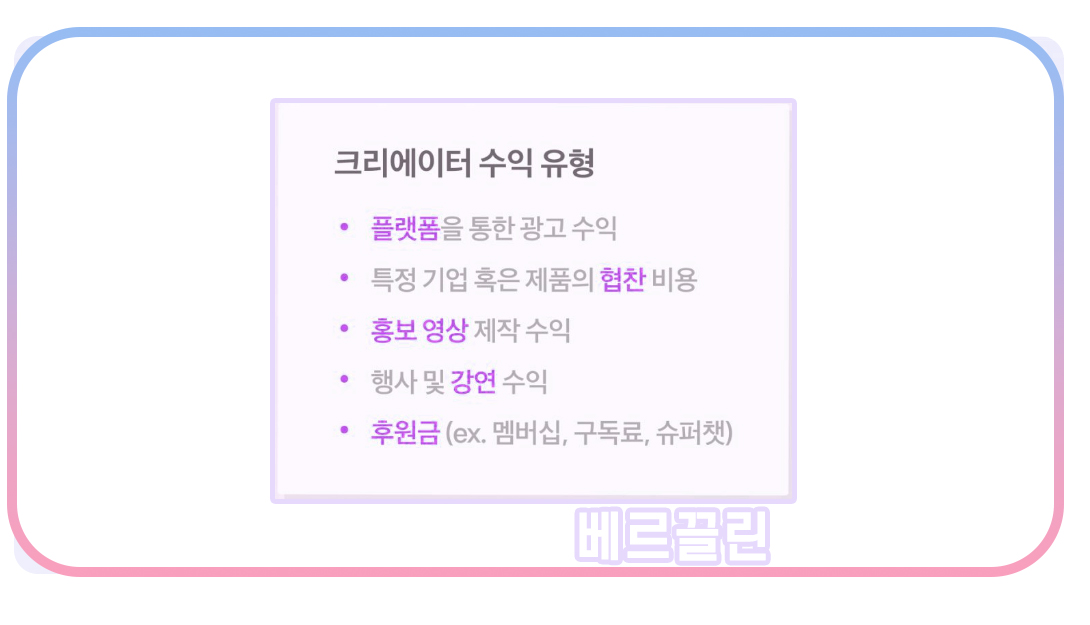 유튜브 채널을 오래 유지하면 다양한 루트를 통해 수익을 창출하게 되는데요.대표적 종류를 구분하면 크게 5개의 큰 축으로 정리해 봤습니다.