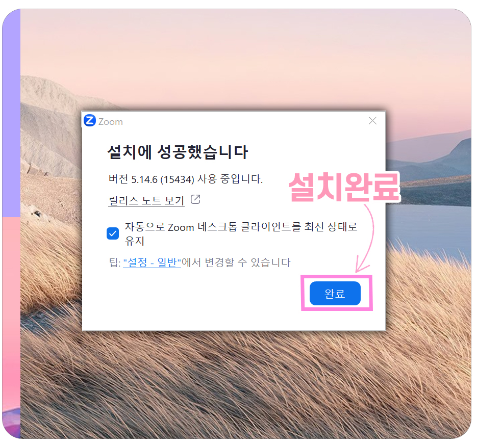 1-5) Zoom PC버전 다운로드 와 설치가 완료되면 위와같은 화면으로 마무리됩니다. '설치에 성공했습니다'라는 창과 함께 위와같은 창이 뜨면 완료 버튼을 누르시면 됩니다. 이 과정으로 Zoom PC 버전 다운로드 및 설치가 끝납니다.