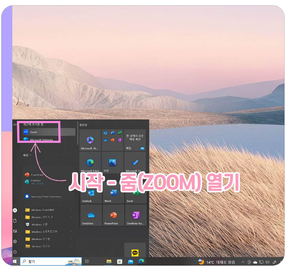 Zoom PC버전이 설치되면 해당 프로그램 실행을 위해 시작버튼을 누르고 Zoom을 클릭해주세요.