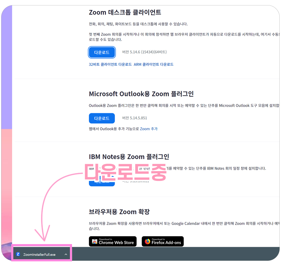 Zoom다운로드를 클릭하면 위와같이 시작줄에 줌 응용프로그램이 다운로드 되는 모습을 보실 수 있습니다.