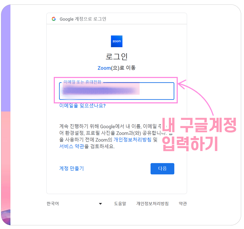 3-3) Zoom을 이용할 구글 이메일 계정으로 로그인을 해줍니다.